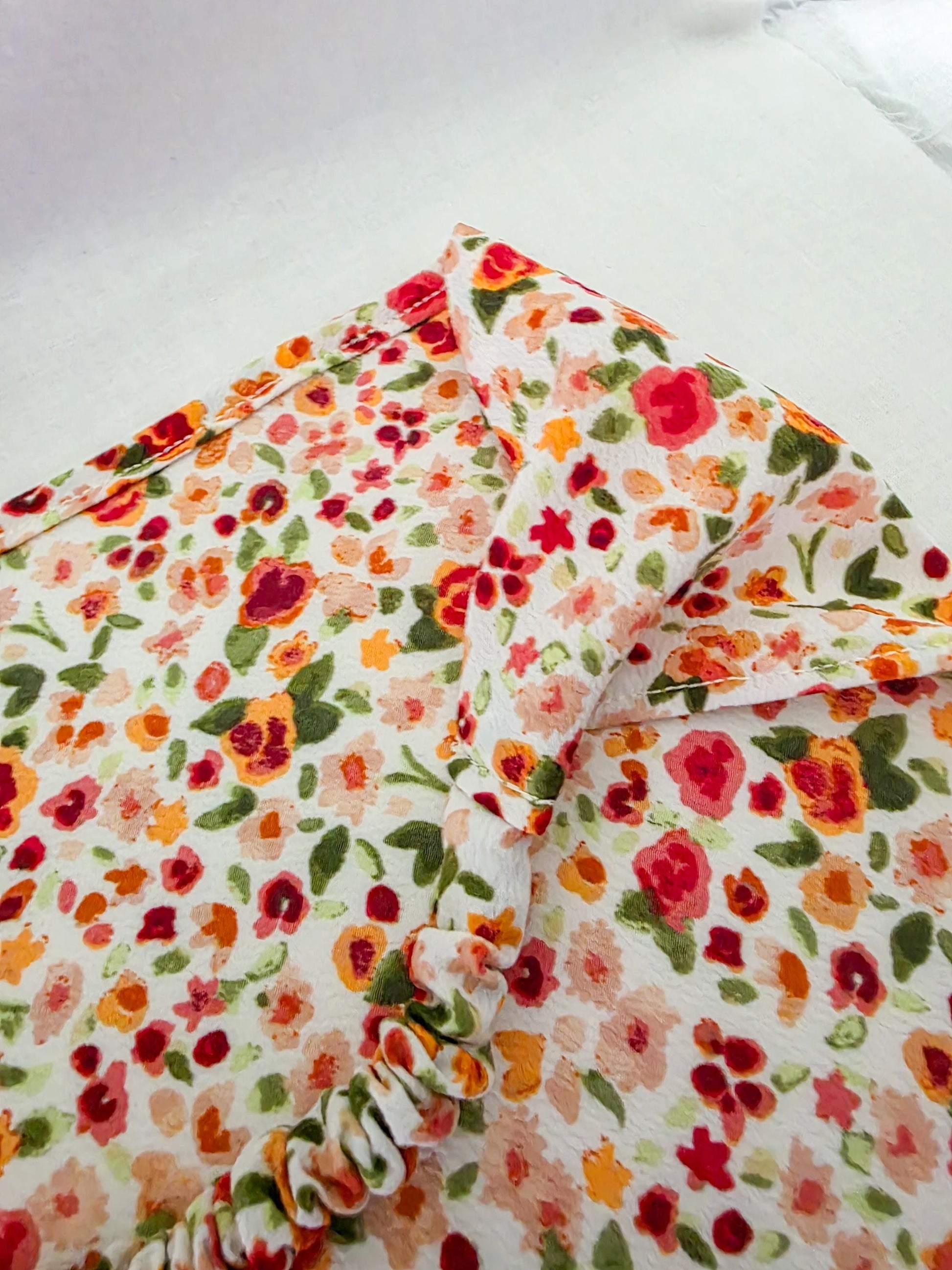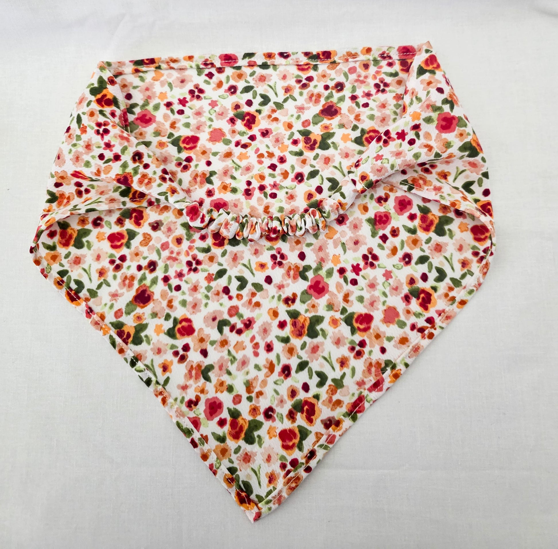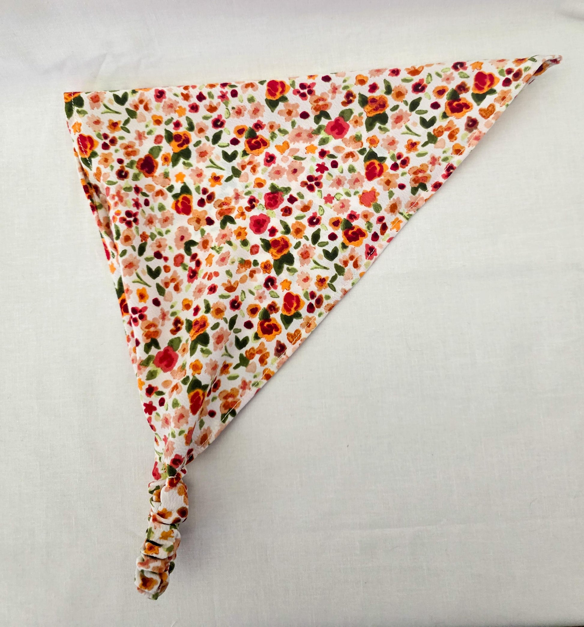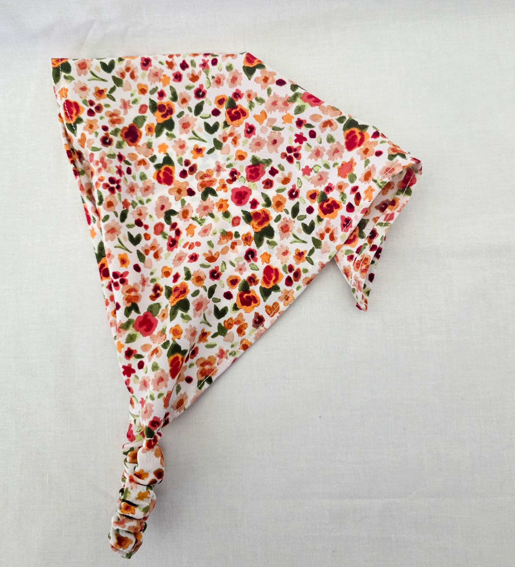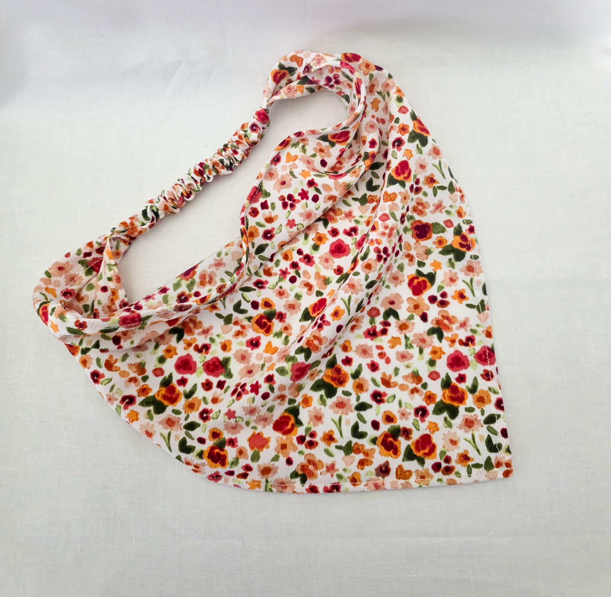 Accessorize your hair with this adorable brightly colored floral print hair bandana! Lightweight and very drapey fabric! This bandana is perfect for adding something extra to your look and helps keep your hair out of your face. The elastic band makes this bandana perfect for shorter hair as there is no bulky tie in the back!